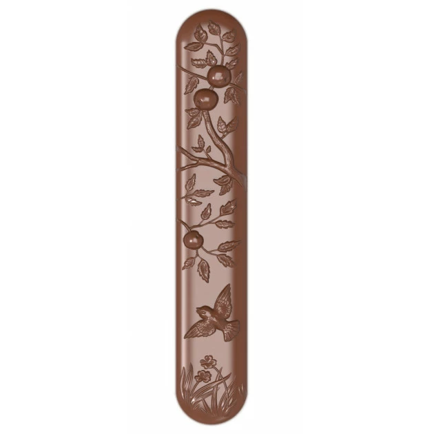 Ornez vos éclairs d’une élégante barre de chocolat réalisée à l’aide du Moule Chocolat Barre pour Eclair Chocolate World. Celle-ci est ornée d’un motif Belle Epoque avec des branches juste fleuries, des fleurs et un oiseau. La barre de chocolat apporte une finition plus soignée que le glaçage, ainsi que du croquant à une pâtisserie où le moelleux et le fondant domine généralement.