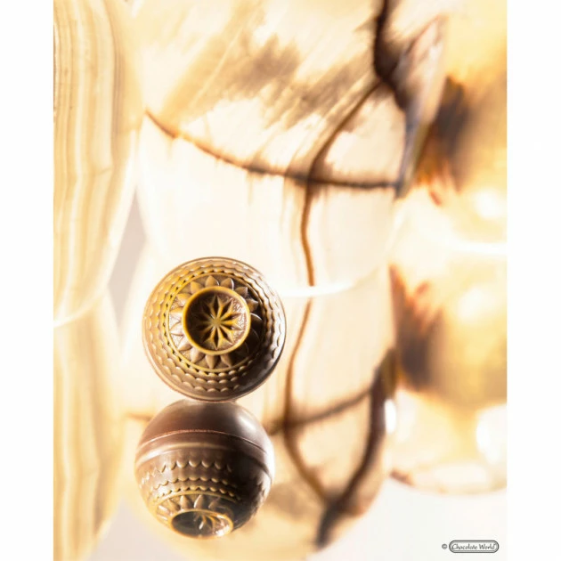 Pour obtenir une sphère, il suffit d’assembler 2 moulages rosaces ou bien d’assembler un bonbon rosace à une demi-sphère lisse grâce au moule chocolat demi-sphère Ø3 cm (x24) Chocolate World.