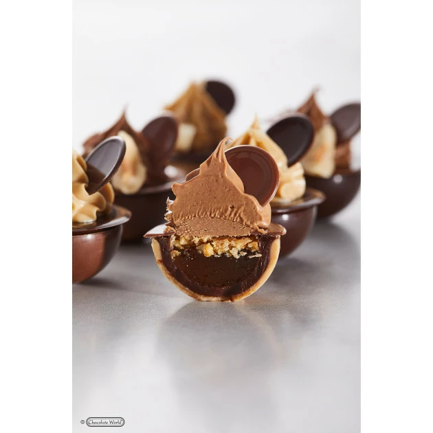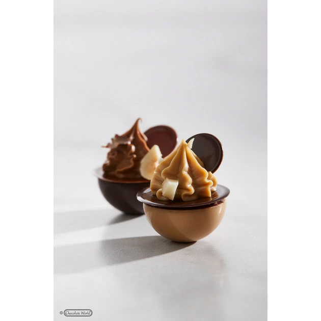 MĂŞme les formes de chocolats les plus simples servent Ă la crĂ©ativitĂ© des travailleurs du chocolat. Le moule sphère aplatie Chocolate World peut servir de base Ă plĂ©thore de crĂ©ations chocolatĂ©es. Que vous soyez un particulier ou un professionnel, ce moule sera l’outil de votre rĂ©ussite. Facile Ă utiliser et Ă entretenir, le moule en polycarbonate vous accompagnera longtemps pour la confection de vos friandises au chocolat.